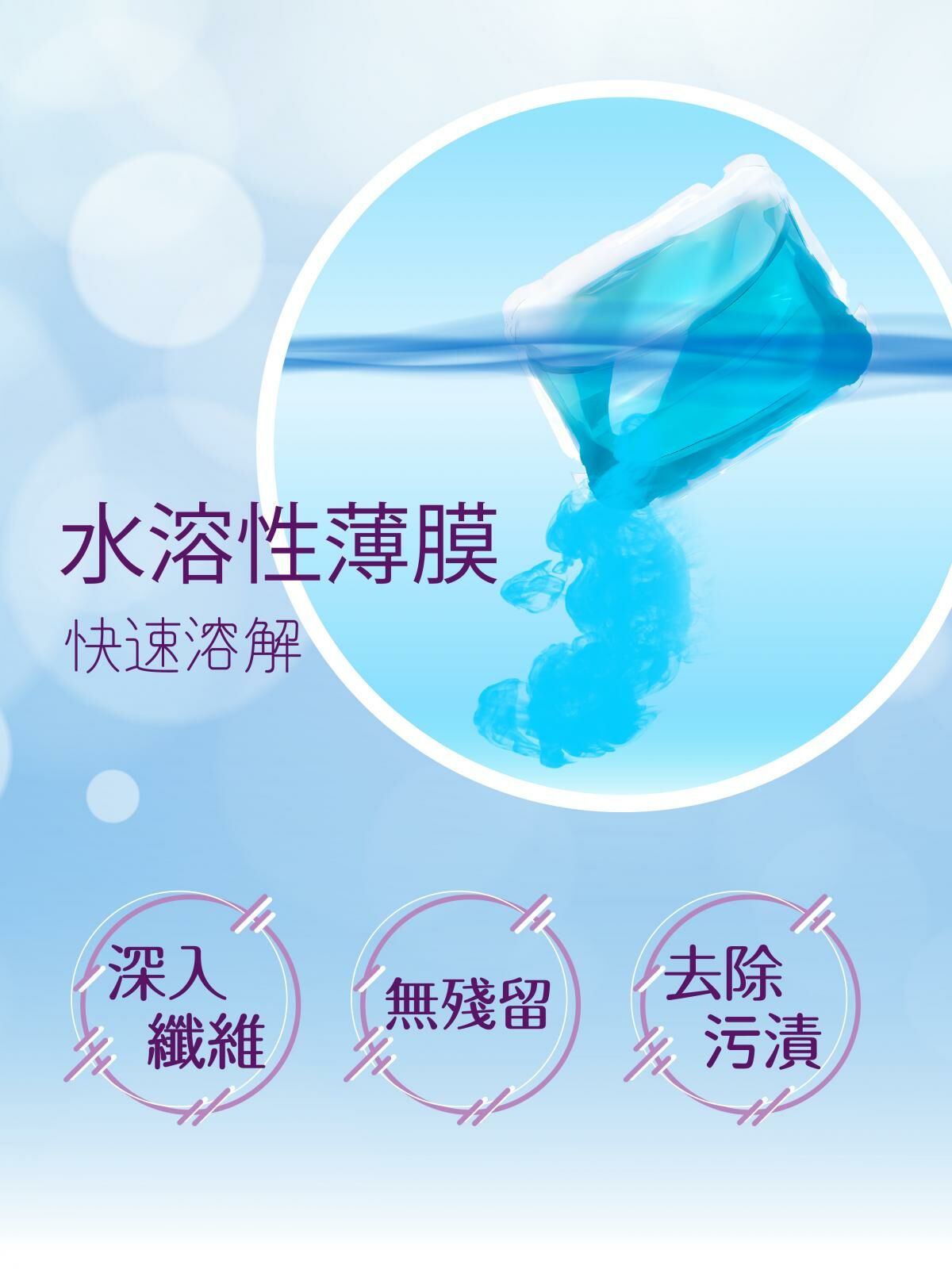 ● 採用水溶膜技術-約2分鐘溶解, 不殘留衣物表面, 不阻塞洗衣機孔