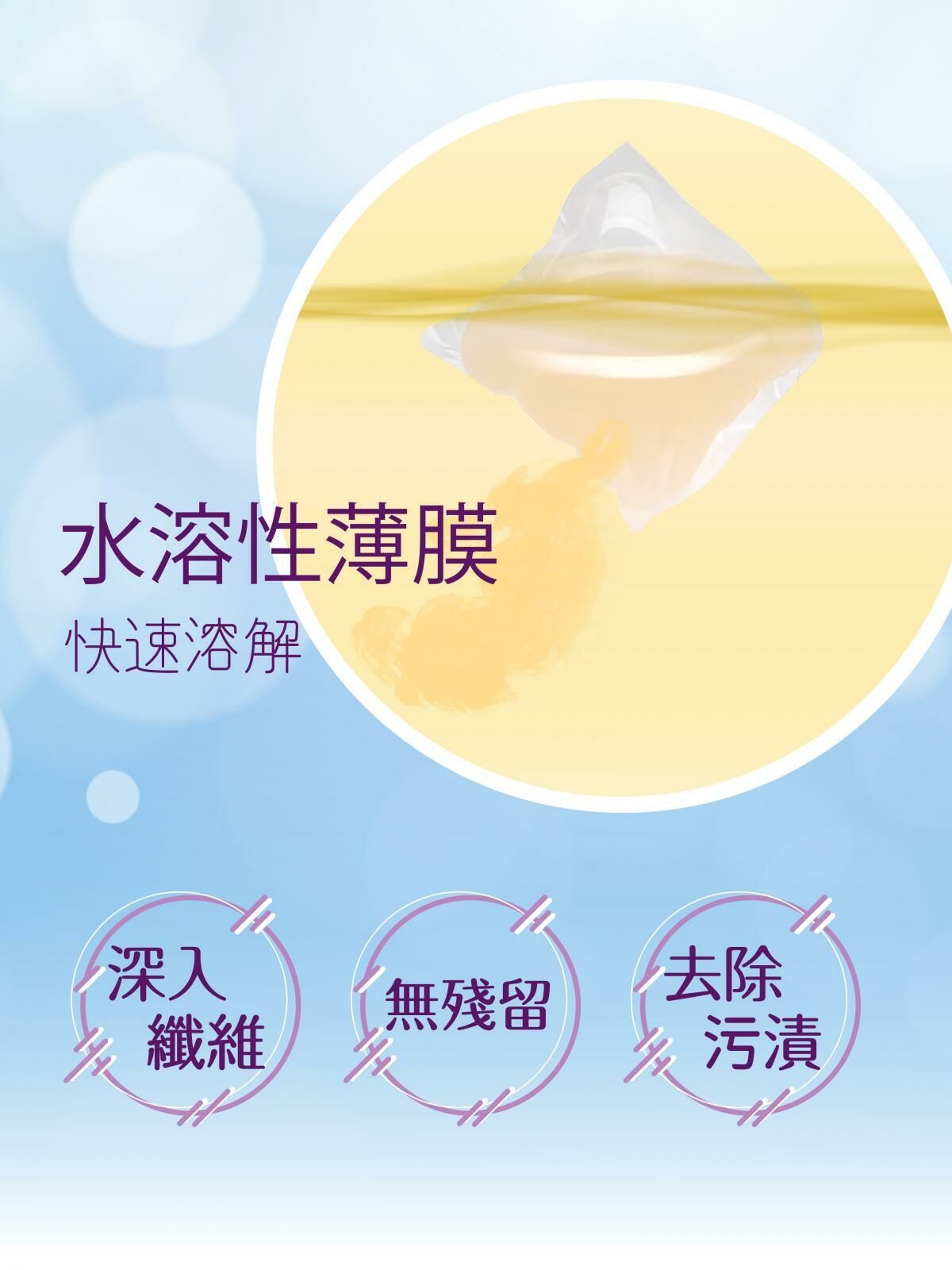 ● 採用水溶膜技術-約2分鐘溶解, 不殘留衣物表面, 不阻塞洗衣機孔
