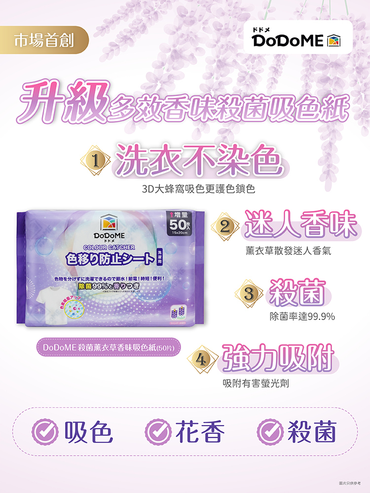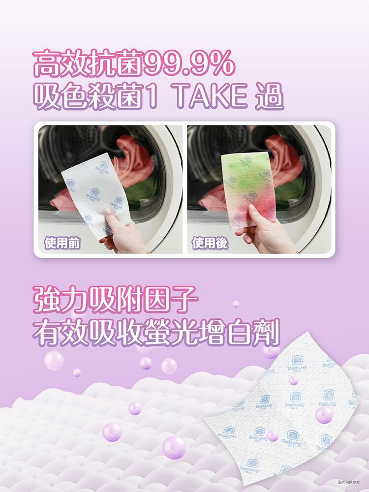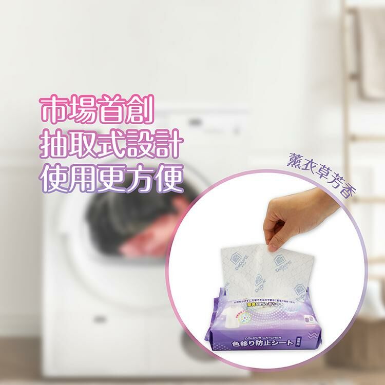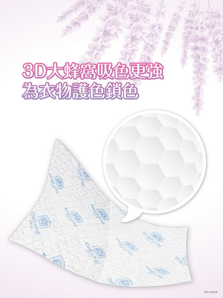 40L 水量以上及脫色嚴重的衣物, 請增加片數或分開清洗 產品名稱: [中]DoDoME 殺菌薰衣草香味吸色紙 (50片