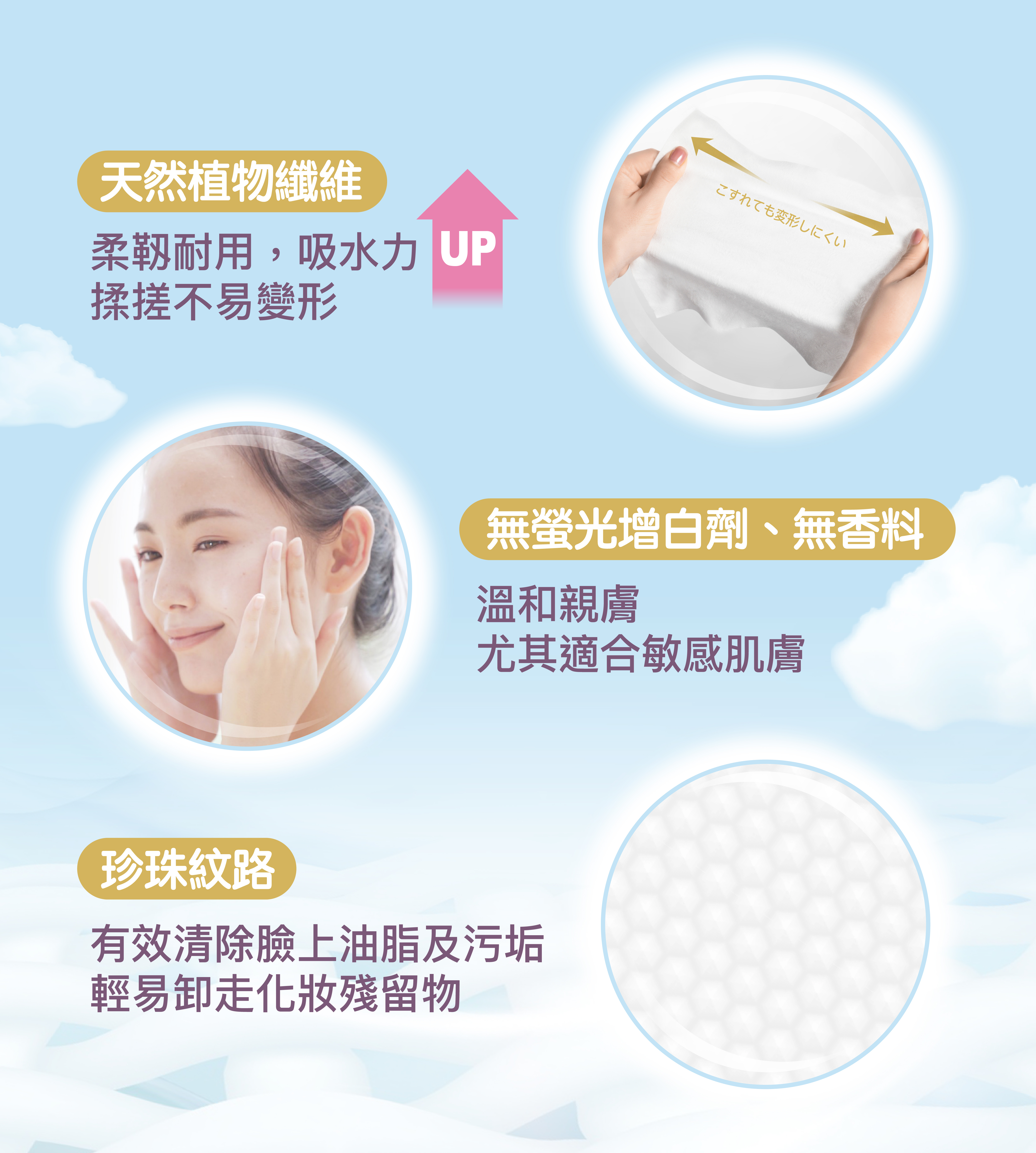 ●珍珠壓紋設計,輕易卸走化妝殘留物